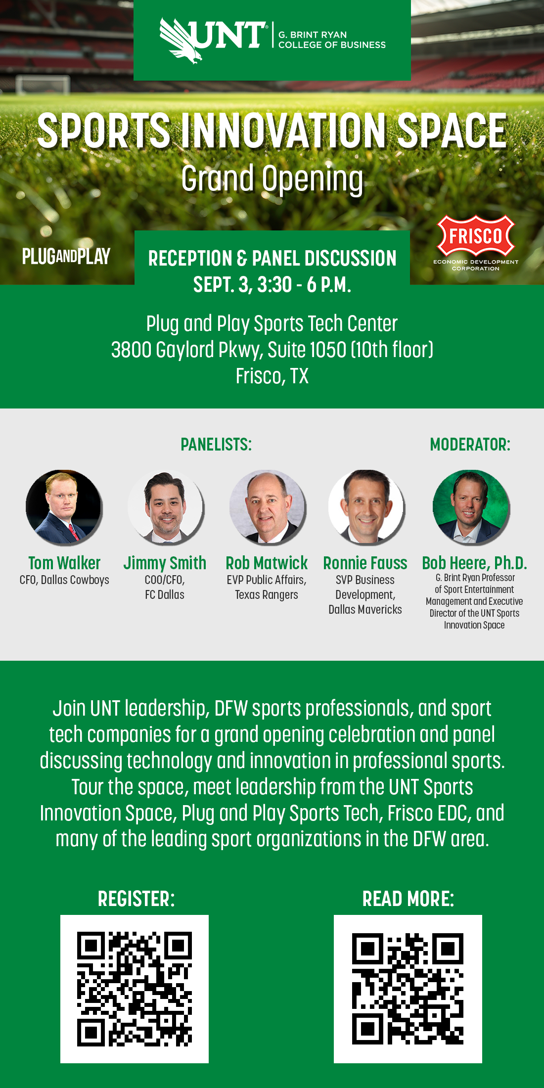 Join UNT leadership, DFW sports professionals, and sport tech companies for a grand opening celebration and panel discussing technology and innovation in professional sports. Tour the space, meet leadership from the Dallas Cowboys, Dallas Mavericks, and Texas Rangers, and network over light bites.